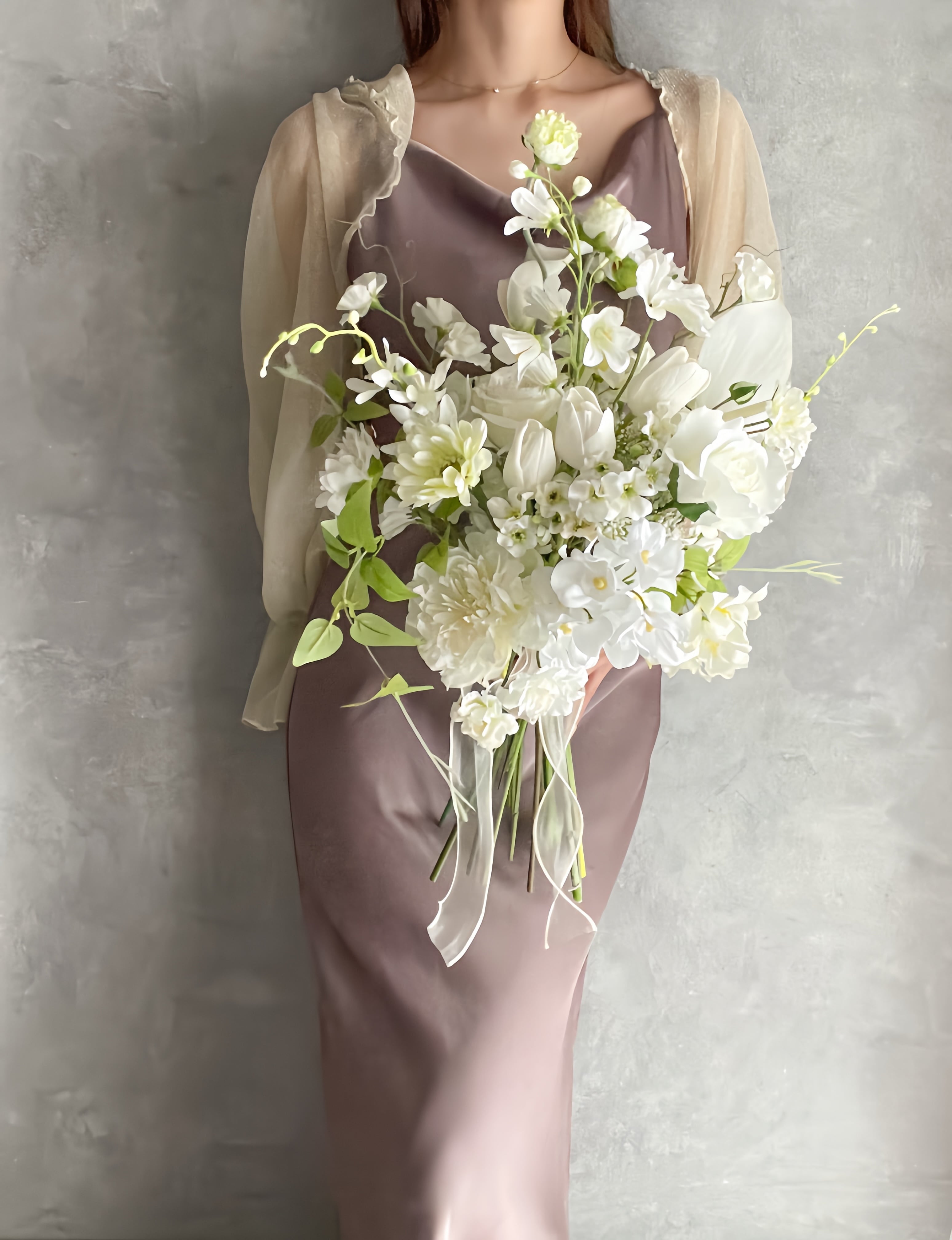 どんなドレスとも相性よく、ウェディングをより引き立てる一束 王道で不動人気のホワイトブーケです
